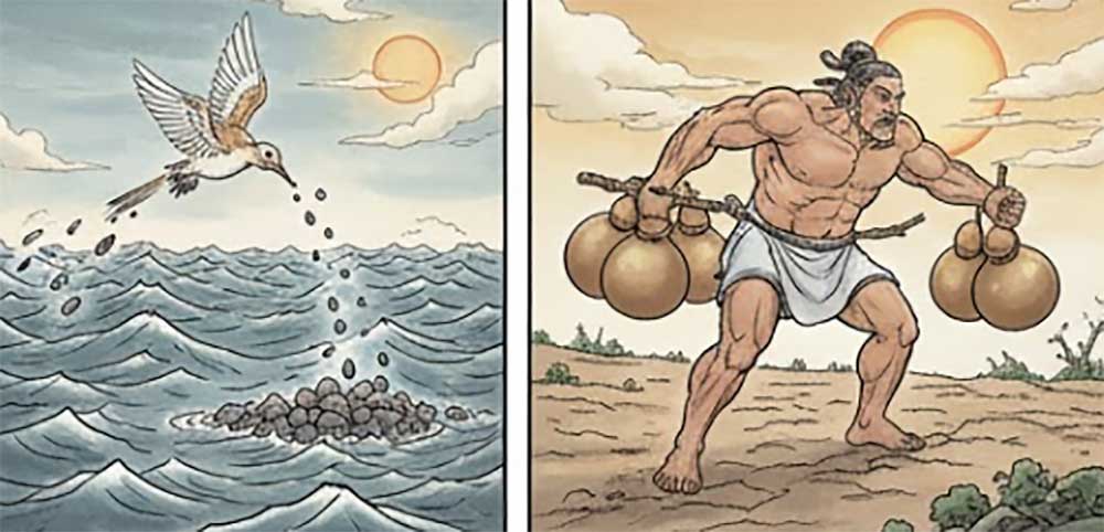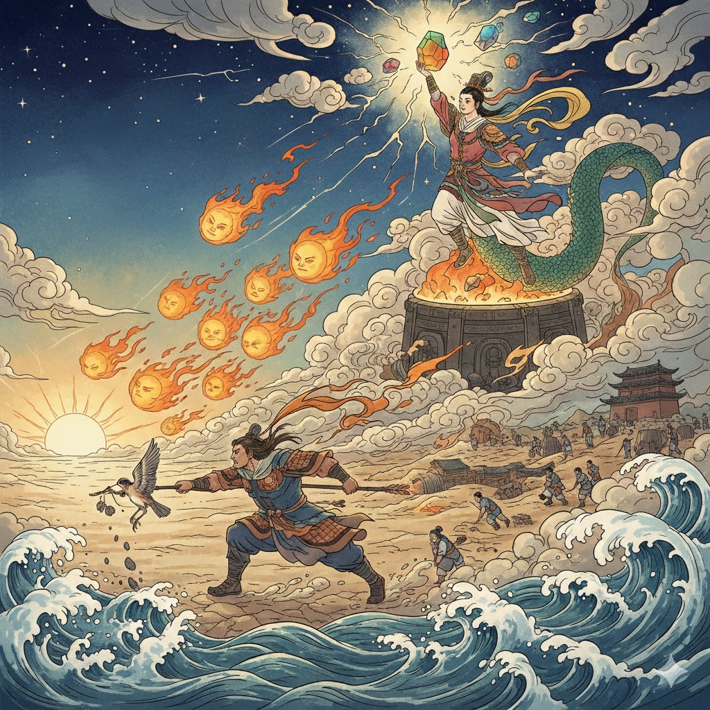 The heroic figures in myths fight bravely to achieve their ideals and are not afraid of sacrifice, embodying a spirit of fearlessness. On the other hand, these stories also reflect the great spirit of the Chinese nation, such as Jingwei filling the sea and Kua Fu chasing the sun. These actions demonstrate a noble national significance, whether to overcome natural disasters or to help the people.