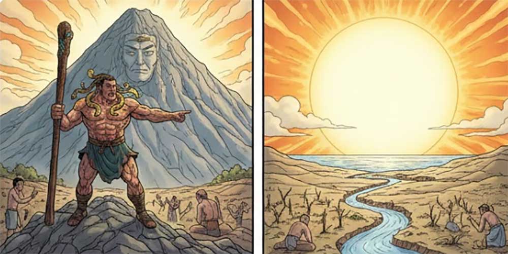 黄帝再次挥剑,将山劈开,刑天的头被找到并埋入山中。