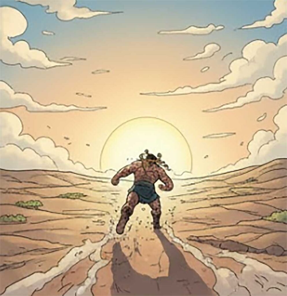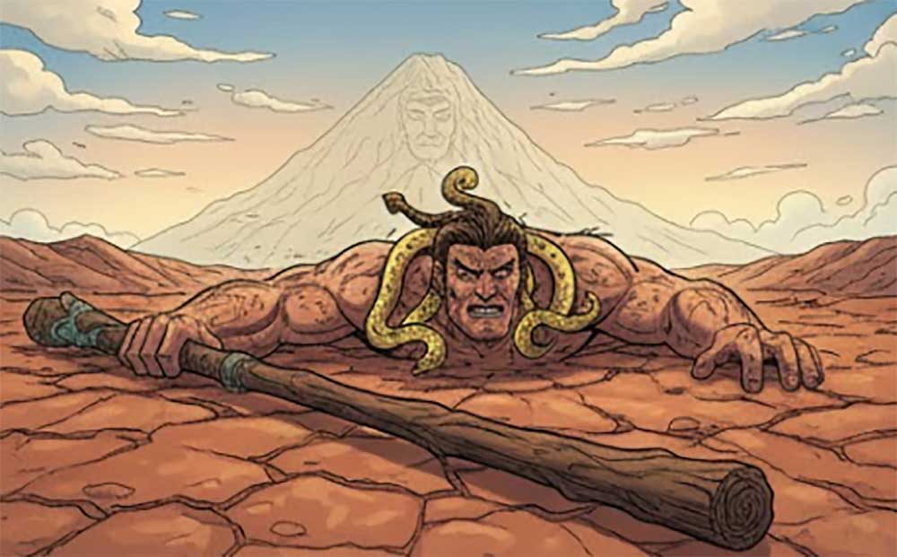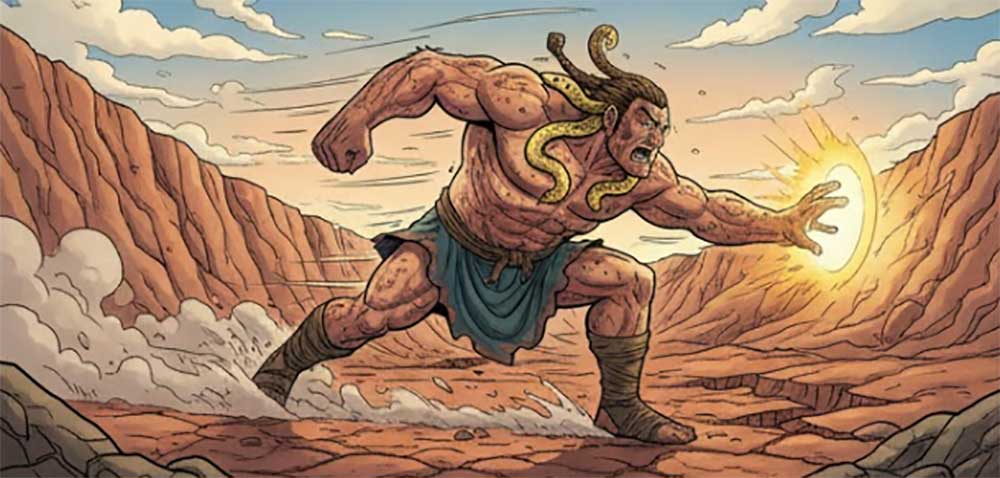 刑天愤怒极了,不甘心就这样败在黄帝手下,他站起来对着黄帝大喊:“黄帝,我要打败你!虽然我没有了头,但我的双乳可以当眼睛,我的肚脐可以发出惊天动地的喊声!”