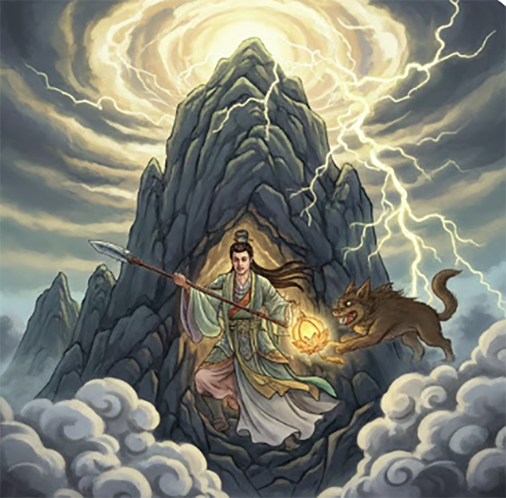 Knowing he could not defeat her, Erlang Shen ordered his hound to steal the treasure while Lady Third was resting. Thus, the pitiful Lady Third was imprisoned by Erlang Shen beneath Mount Hua in the Black Cloud Cave.