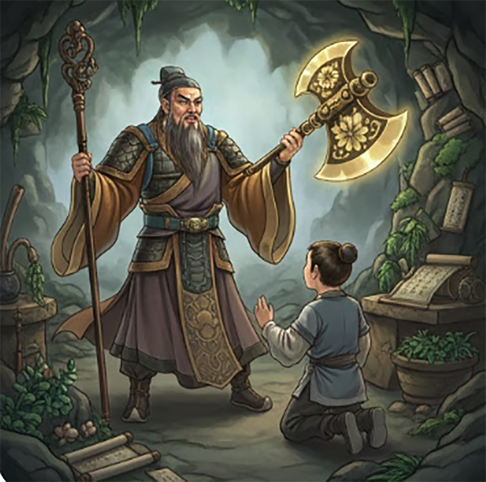 On his sixteenth birthday, Chenxiang bade farewell to the immortal and set out to rescue his mother at Mount Hua. The immortal praised his resolve and gave him a divine axe capable of splitting mountains.