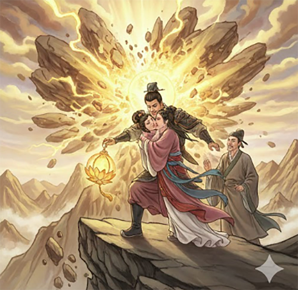 Riding on clouds and mist, Chenxiang arrived at Mount Hua and loudly called for his mother. His voice pierced through layers of rock and reached Lady Third’s ears. Overwhelmed with emotion, she knew her son had grown up and had come to rescue her out of filial devotion.