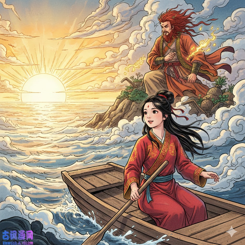 But her father was always too busy to agree. So one day, Nüwa set out alone in a small boat toward the place in the Eastern Sea where the sun rose.