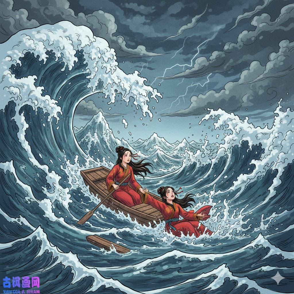 Unfortunately, a violent storm arose at sea. Towering waves like mountains overturned her boat, and the merciless ocean swallowed Nüwa, never to return.